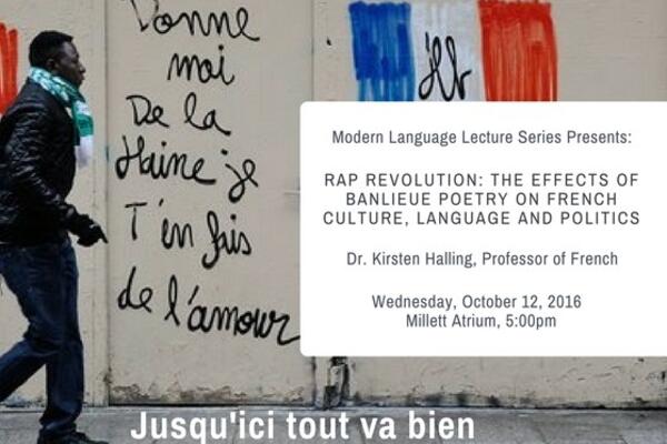 The department of Modern Languages invited all faculty, students and staff to the tenth presentation in its lecture series, “Rap Revolution: The Effects of Banlieue Poetry on French Culture, Language and Politics" on October 12, 2016. Dr. Halling is a Professor of French in the department of Modern
