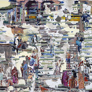 I build my recent works as multiple images woven together layer upon layer to open up interfering visual worlds. These works reflect an interest in describing simultaneous locations/positionings and in multiplying the point of view to make relative its importance, possibly to disintegrate it entirely. The physical process of making, in which an homage to Jack Whitten is implicit, yields an ambiguity that I consider the proper medium of my work. Source-images come from the three cultural environments that contribute to my flaky sense of identity (Romanian, North American, and Indian); issues of memory, history, identity, absence, transience, and discontinuity appear in and motivate the work. I am interested in layering because it encapsulates time and is ambiguous in its oscillation between revealing and obscuring. The visual accumulation comes from and addresses an awareness of the perpetual re-orientation, re-interpretation (including self re-interpretation) that is typical of the immigrant experience I belong to. The canvas, as well as what happens on it, becomes a space without place that reveals meaning only when set in motion, shifting from one thing to another.