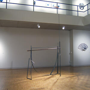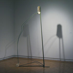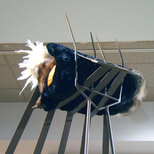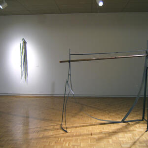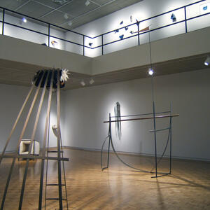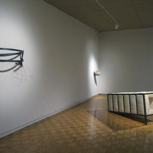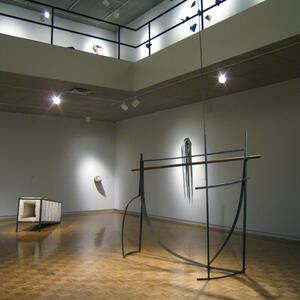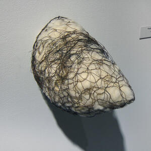The work currently on display at the Wright State University Art Galleries combines the physical labor and farming culture that defined her early childhood with the trade and domestic skills she acquired in that environment. Garand combines natural fibers with manmade objects, juxtaposing wood with metalworks, creating a delicate balance of opposities at work.